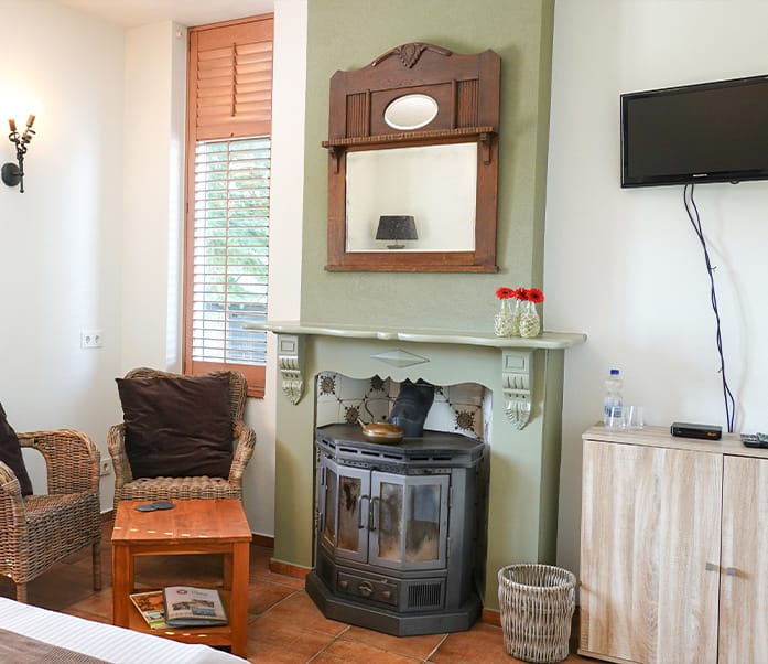 Een heerlijke kamer met veel lichtinval. Deze kamer heeft een gezellig zitje bij de karakteristieke boerenhaard.
